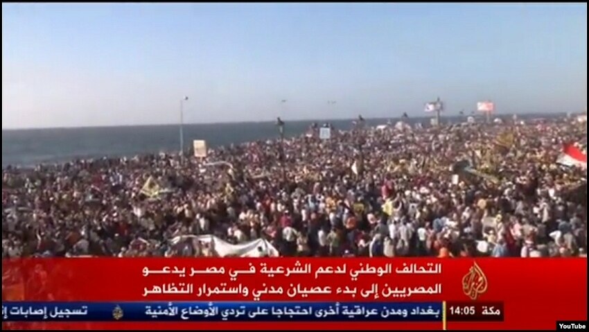 A screenshot of Aljazeera channel showing anti-government protests in the Egyptian port city of Alexandria on Aug. 30, 2013